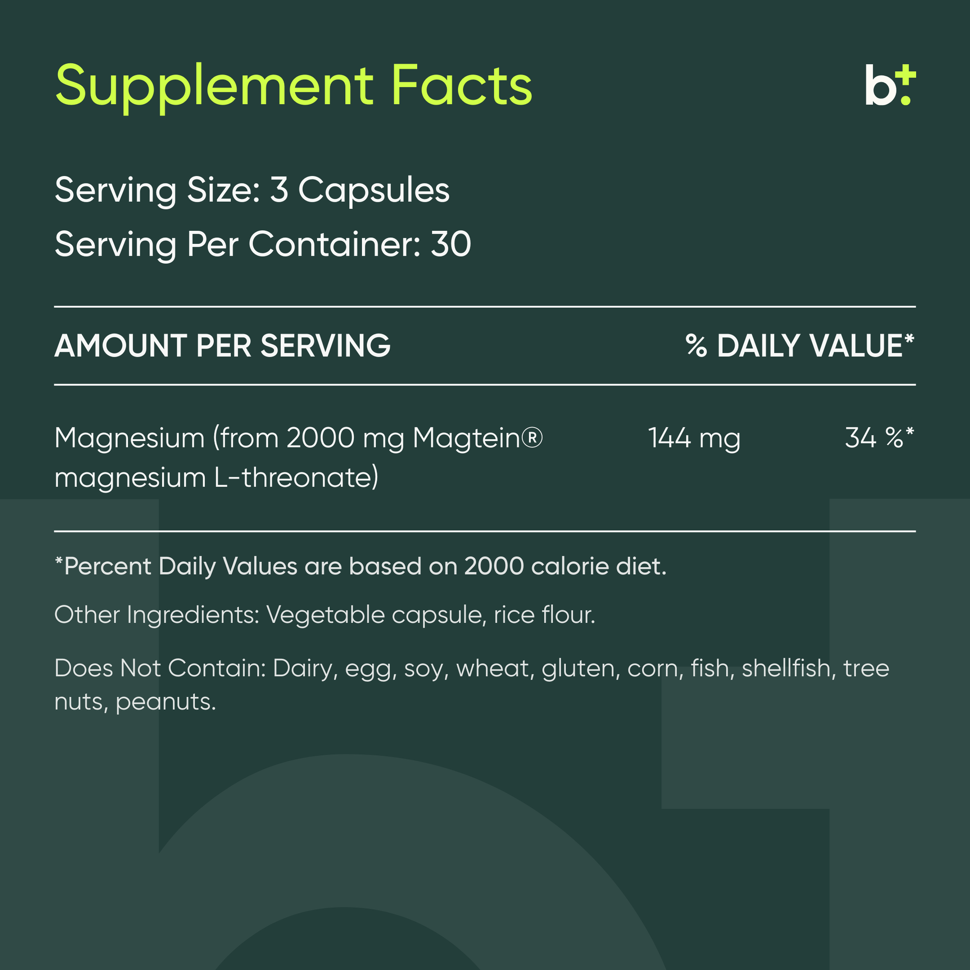 Each serving provides 2000mg of Magtein® magnesium L-threonate (144mg elemental magnesium).