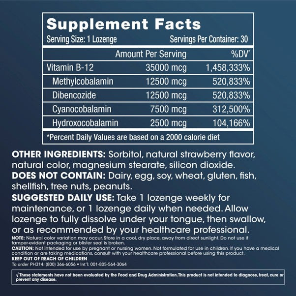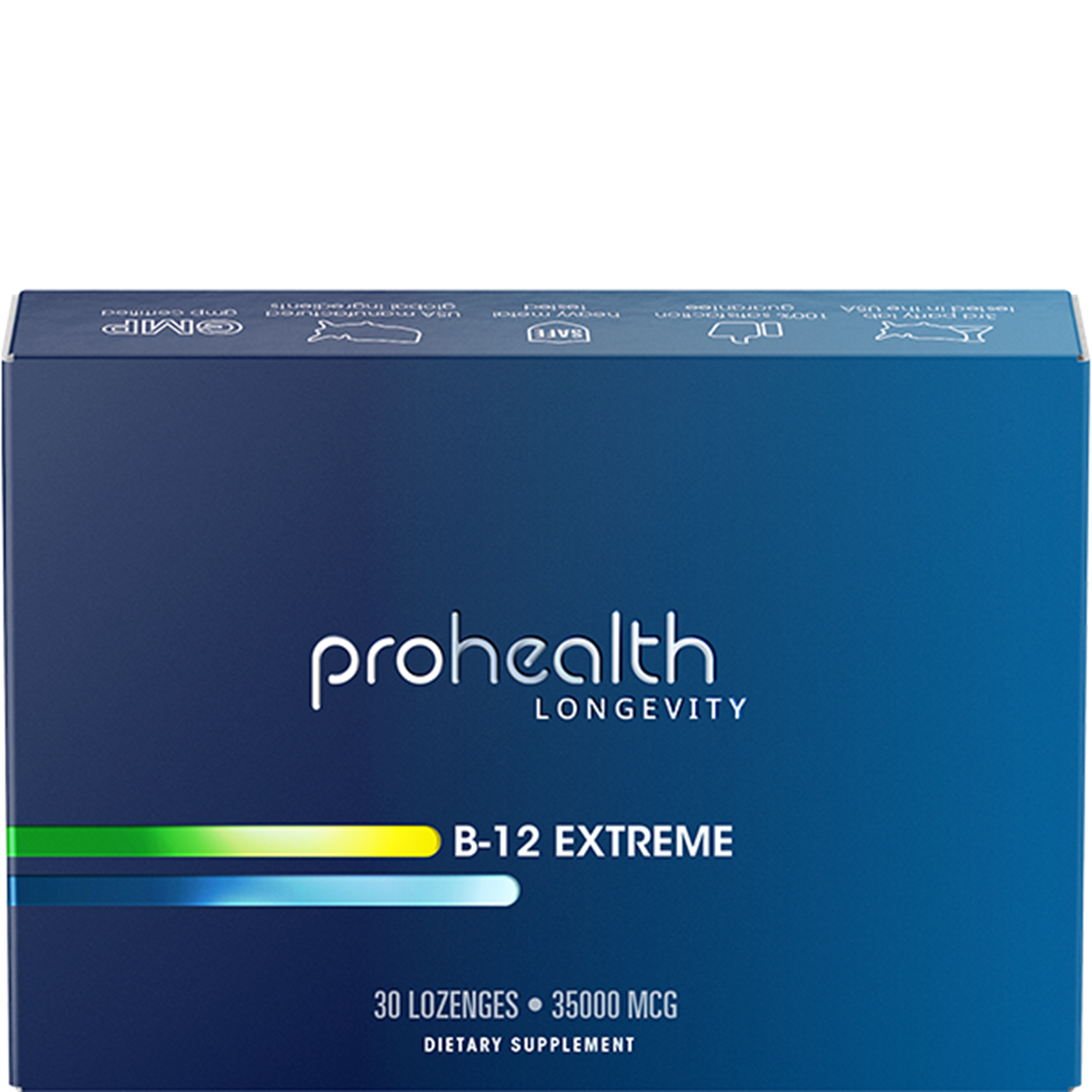 ProHealth B-12 Extreme is a high-potency vitamin B-12 supplement designed to support energy, mental acuity, cellular health, liver detoxification, and overall well-being. Each lozenge provides 35,000 mcg of all four forms of vitamin B-12, including the two biologically active forms, methylcobalamin and dibencozide, to enhance absorption and maximize benefits.
