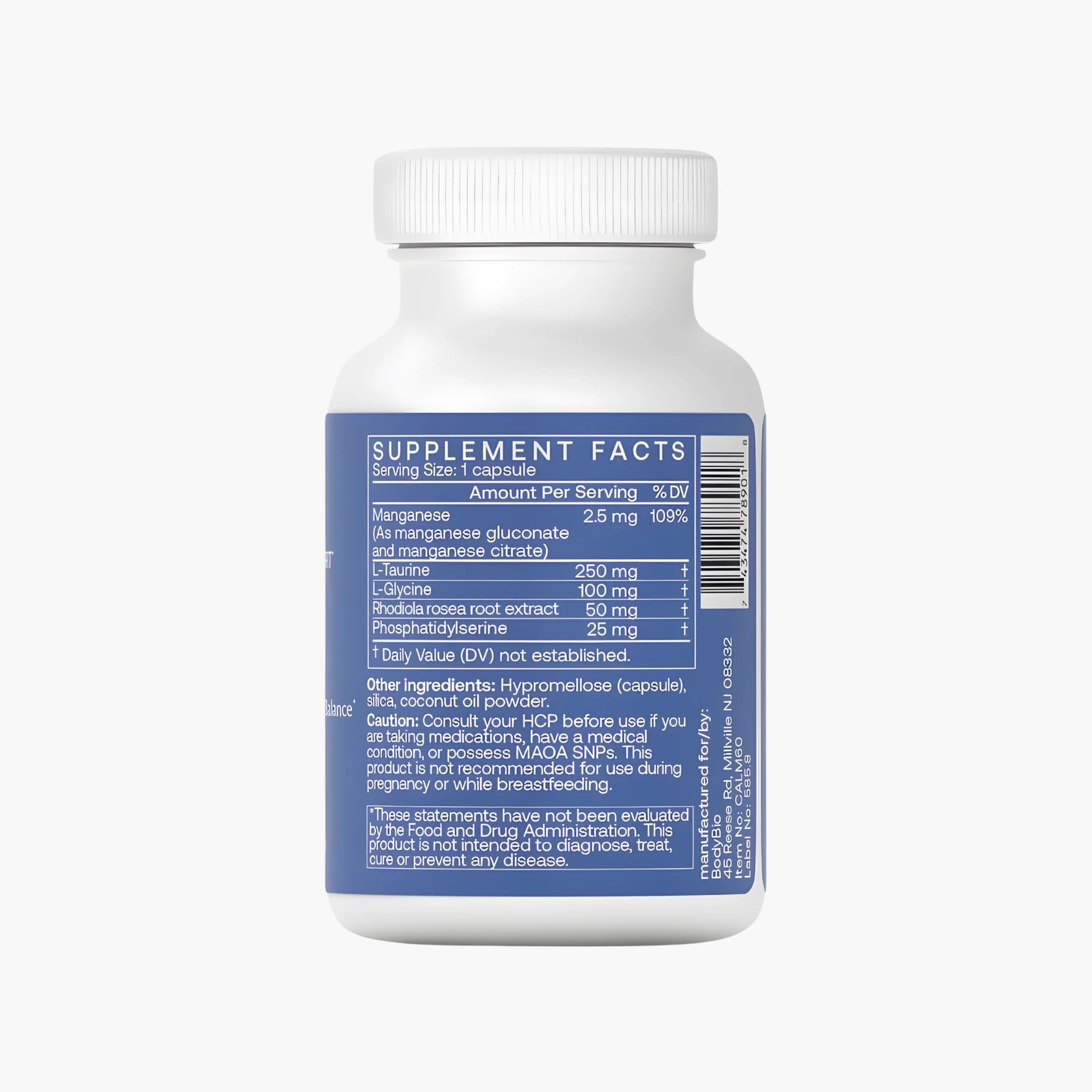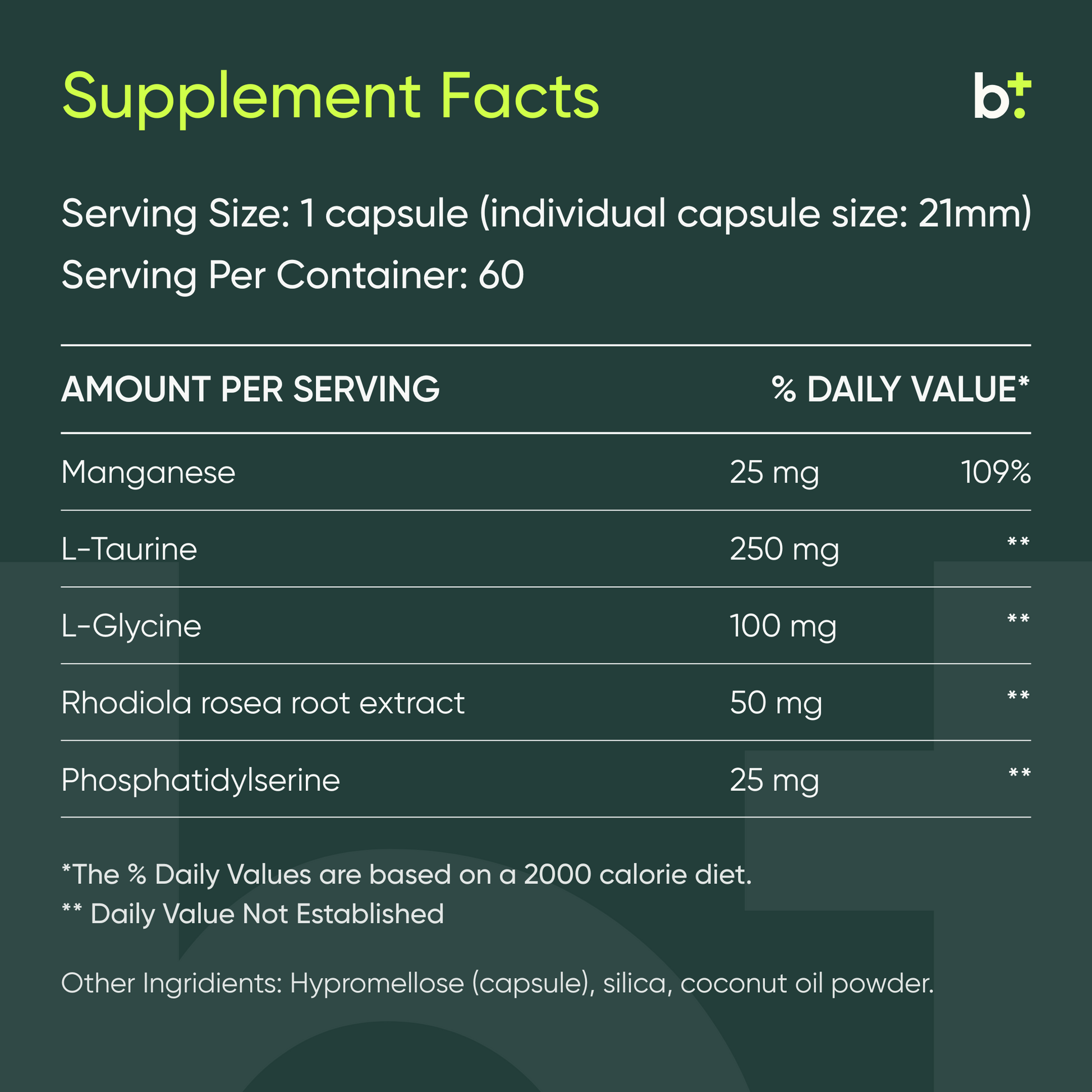 Manganese (as Gluconate and Citrate), L-Taurine, L-Glycine, Rhodiola Rosea Root Extract, Phosphatidylserine (Soy-Free), Hypromellose (capsule), Silica, Coconut Oil Powder