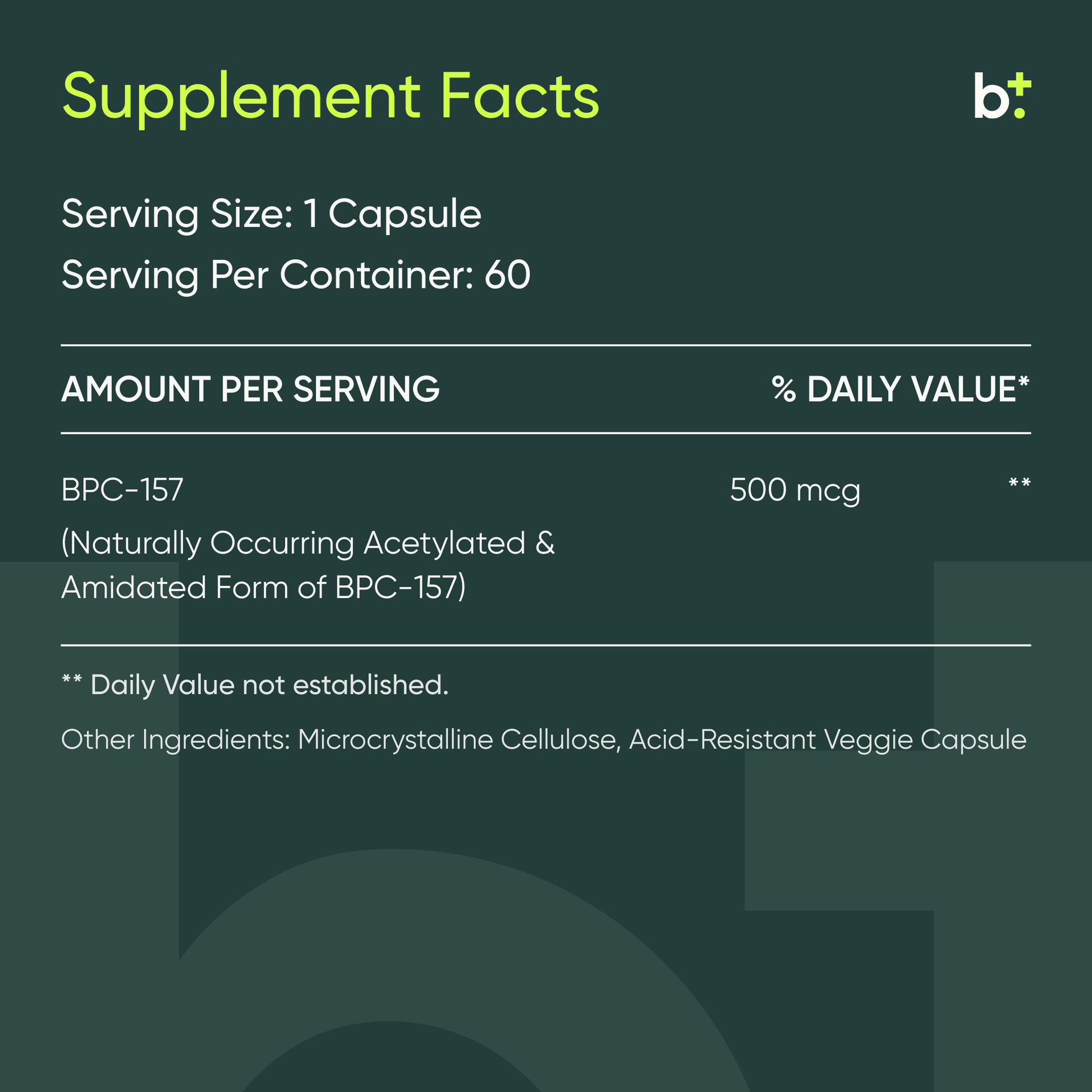 BPC-157 (Naturally Occurring Acetylated and Amidated Form) 500 mcg, Microcrystalline Cellulose, Delayed Release Vegetable Capsule