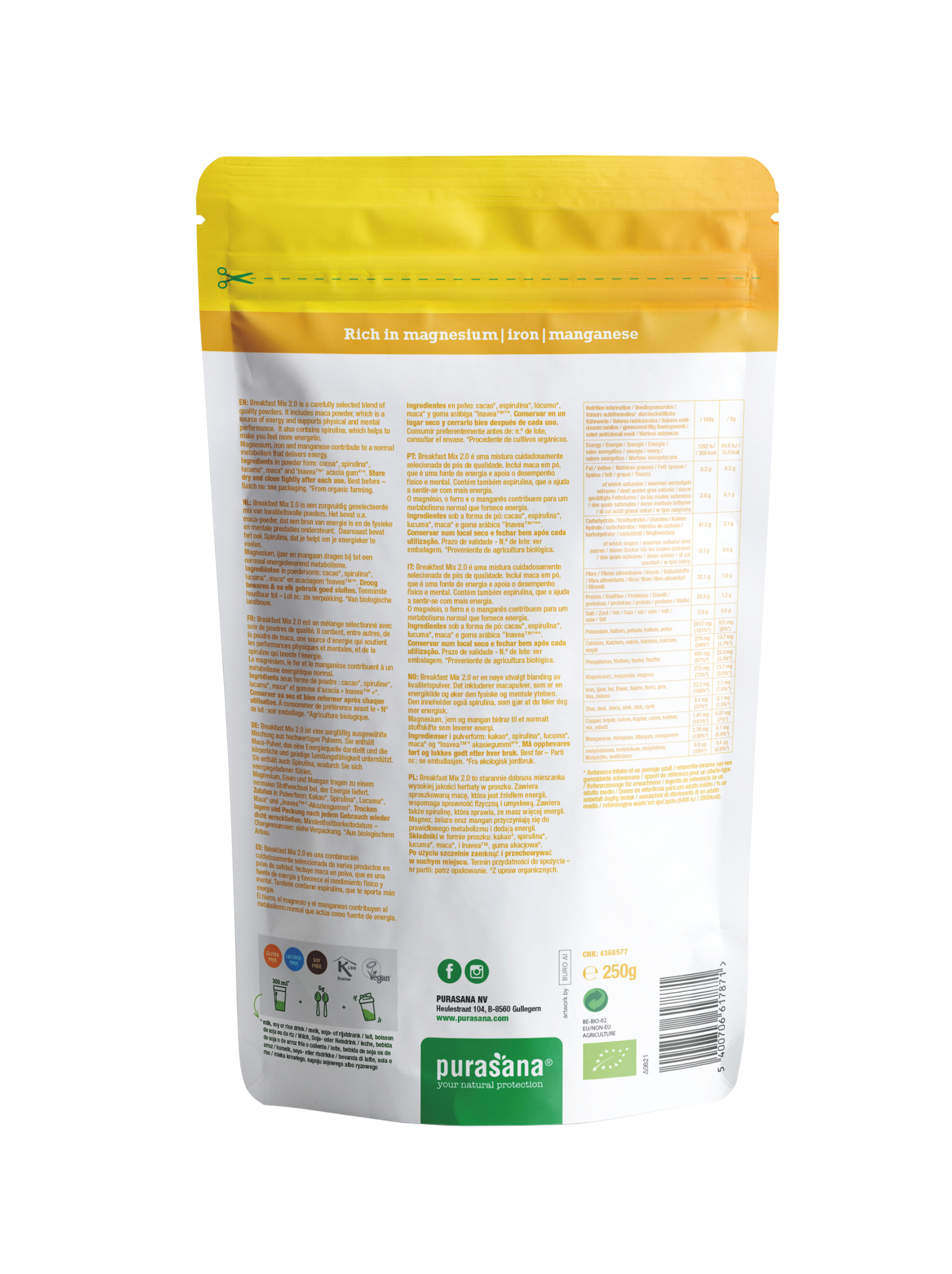Add 3 teaspoons (approximately 5g) of Breakfast Mix 2.0 to 300ml of water, plant-based milk, or your favorite smoothie.