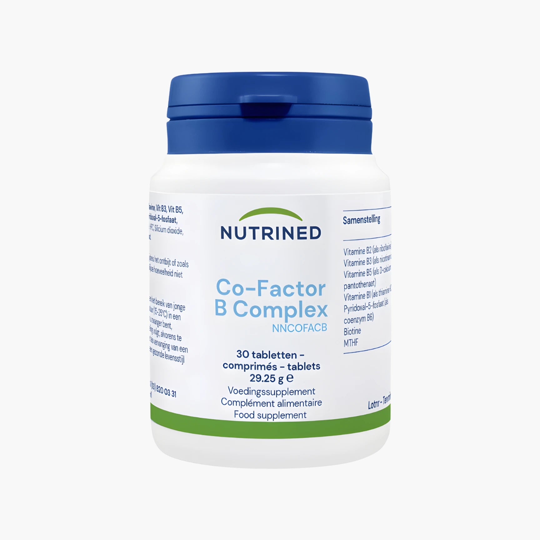 Microcrystalline cellulose, Riboflavin (B2), Calcium hydrogen phosphate dihydrate, Niacin (B3), Pantothenic acid (B5), Thiamine (B1), Pyridoxal-5-phosphate (P5P), Rice starch, Diglycerides of fatty acids, Hydroxypropyl cellulose, Silicon dioxide, Rapeseed oil, Biotin, Calcium-L-methyltetrahydrofolate, Vitamin B12