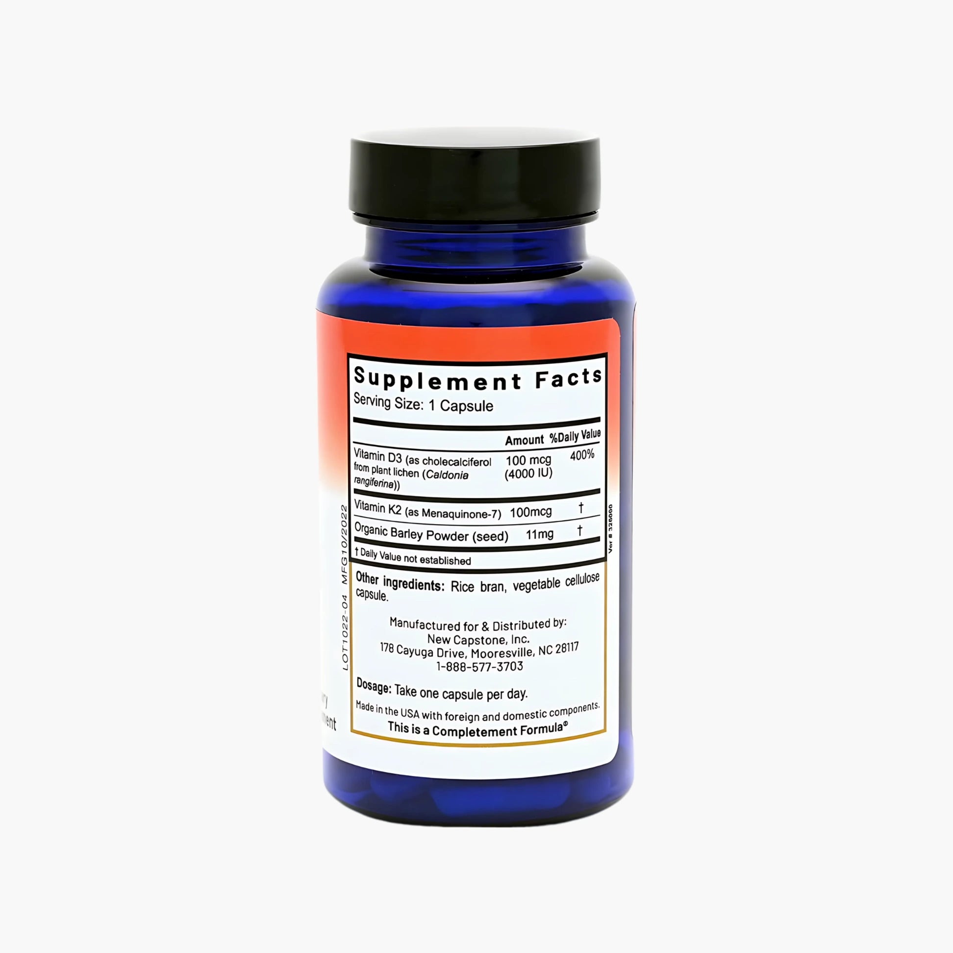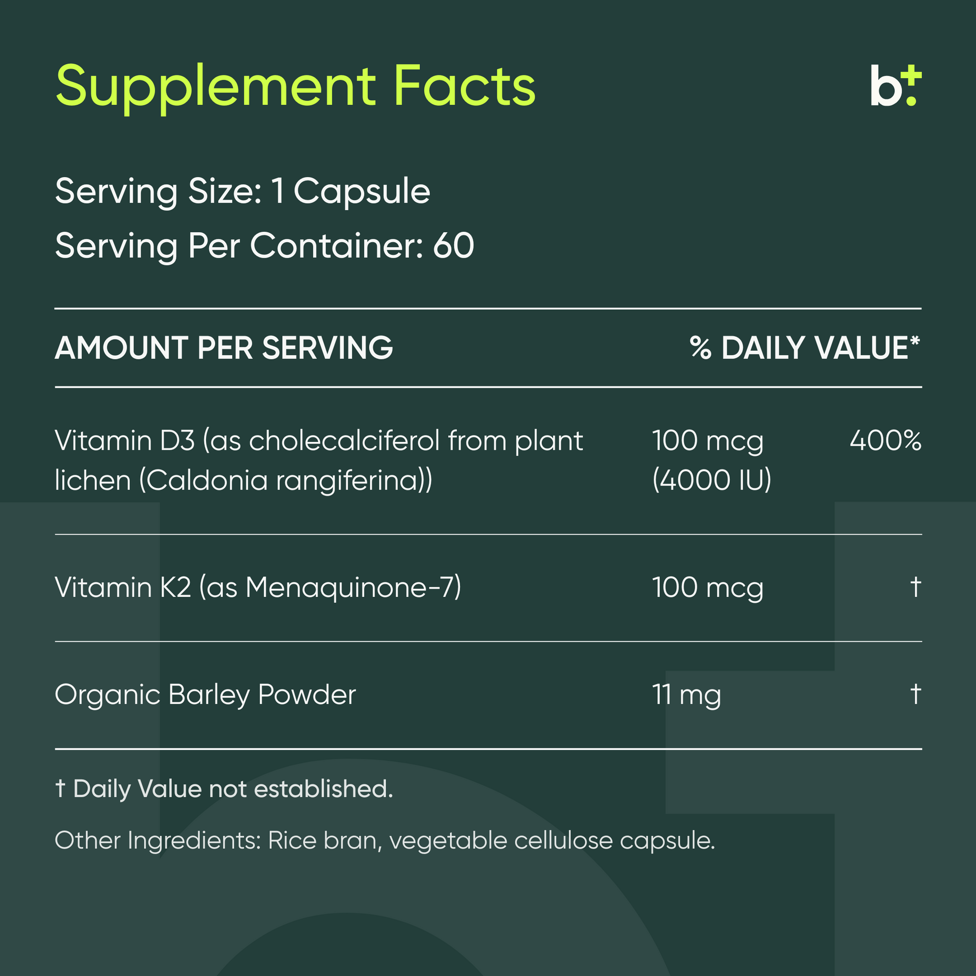 It provides 4,000 IU of vitamin D3 from plants (not animals) and 100mcg of vitamin K2 from fermented soybeans.
