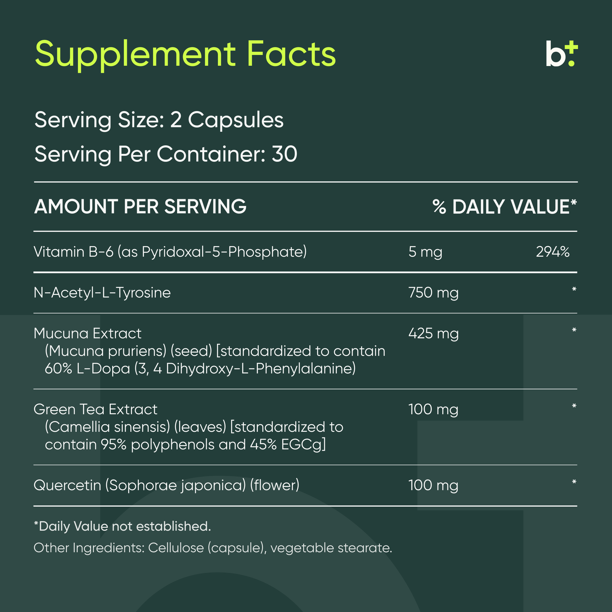 N-Acetyl-L-Tyrosine 750mg, Mucuna pruriens (standardized to 60% L-DOPA) 425mg, Green Tea Extract (standardized to 50% EGCG) 100mg, Quercetin 100mg, Vitamin B6 (as Pyridoxal-5-Phosphate) 5mg, Cellulose (capsule), Vegetable stearate