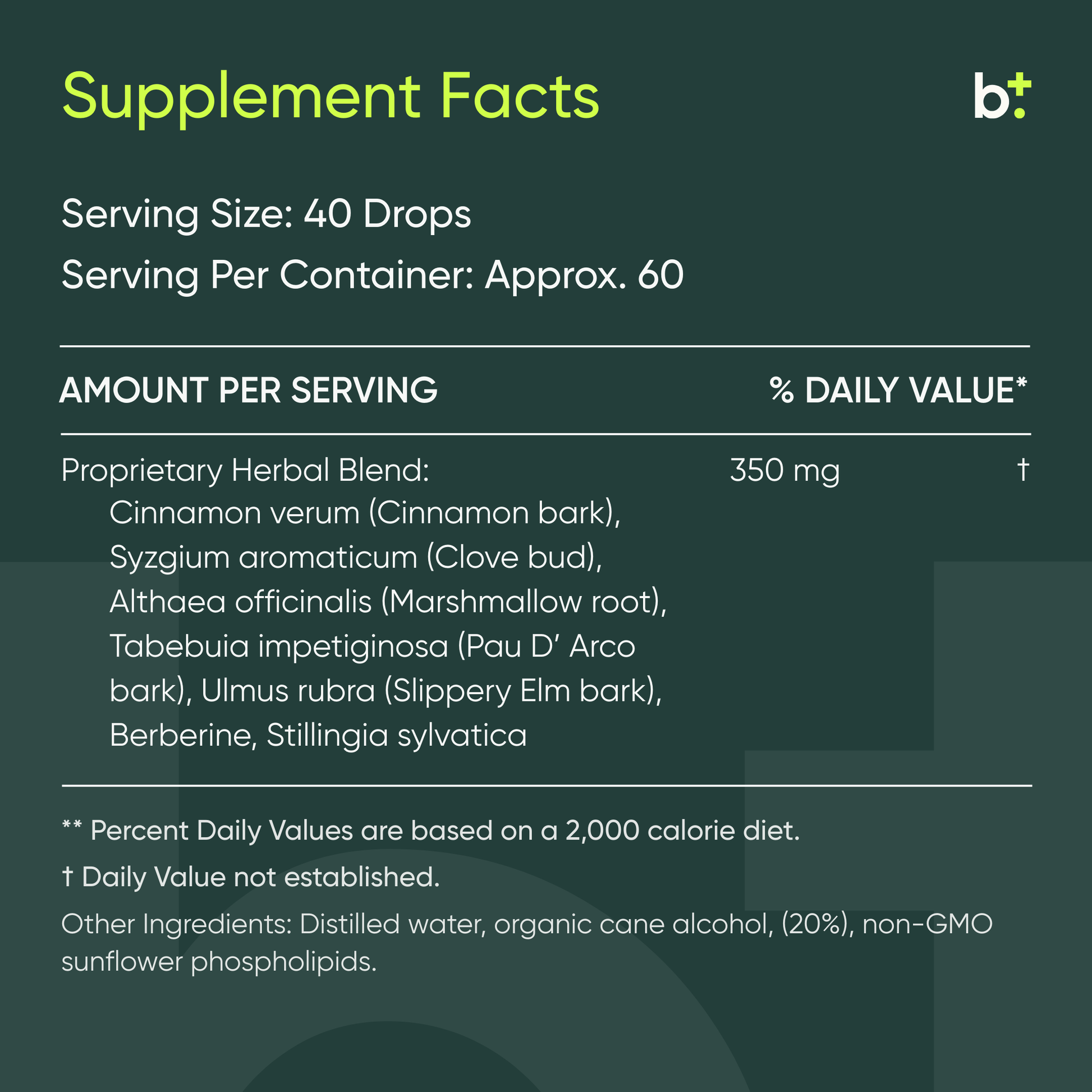 Cinnamon verum (Cinnamon bark), Syzgium aromaticum (Clove bud), Althaea officinalis (Marshmallow root), Tabebuia impetiginosa (Pau D'Arco bark), Ulmus rubra (Slippery Elm bark), Berberine, Stillingia sylvatica, Distilled water, Organic cane alcohol (20%), Non-GMO sunflower phospholipids