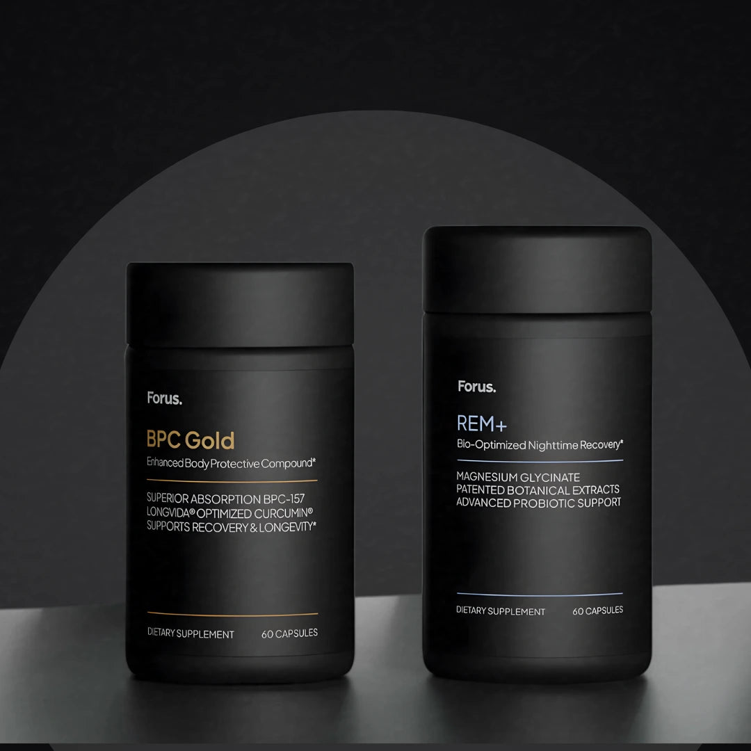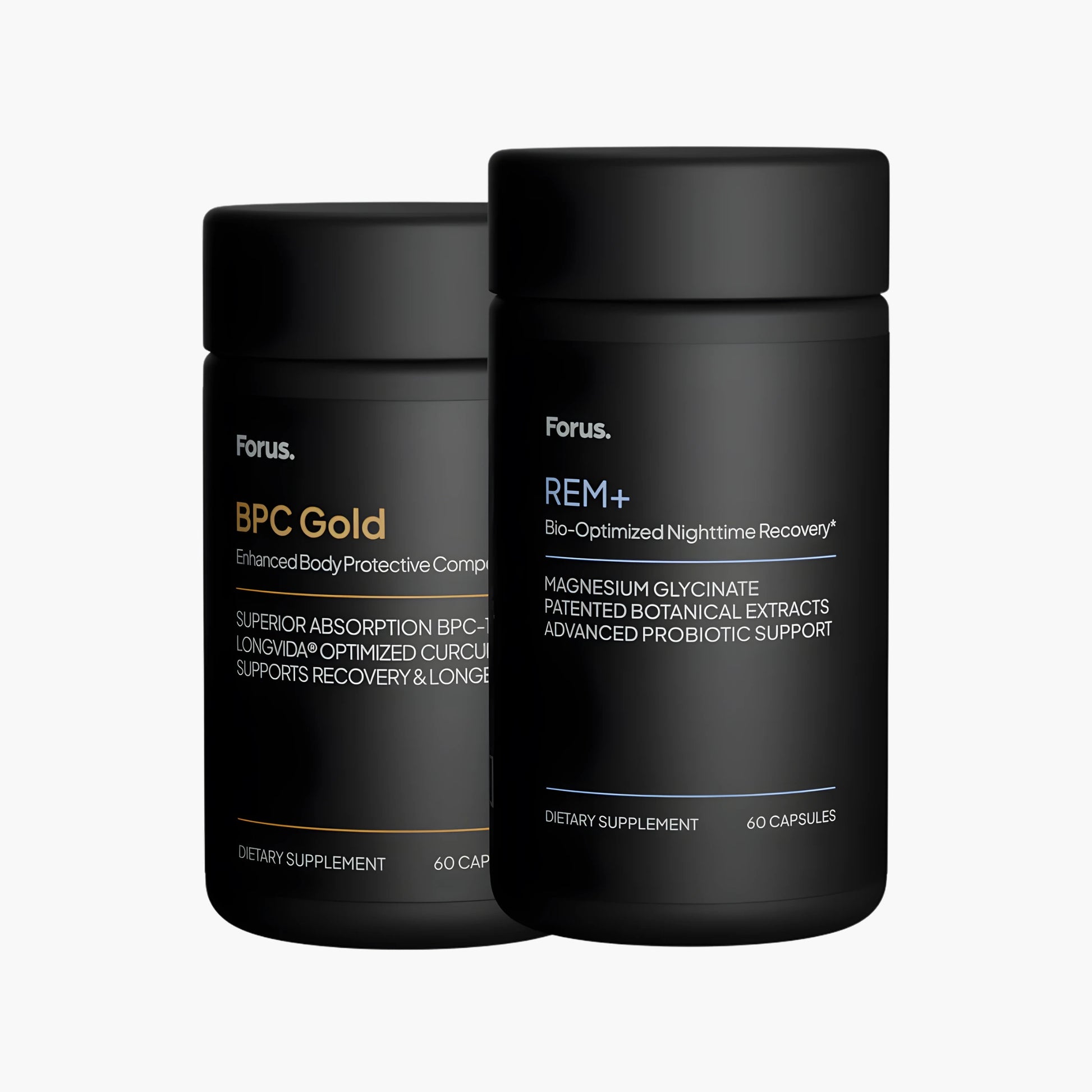 The Forus Protocol is your complete recovery and longevity system, combining BPC Gold for daytime cellular repair with REM+ for nighttime regeneration.