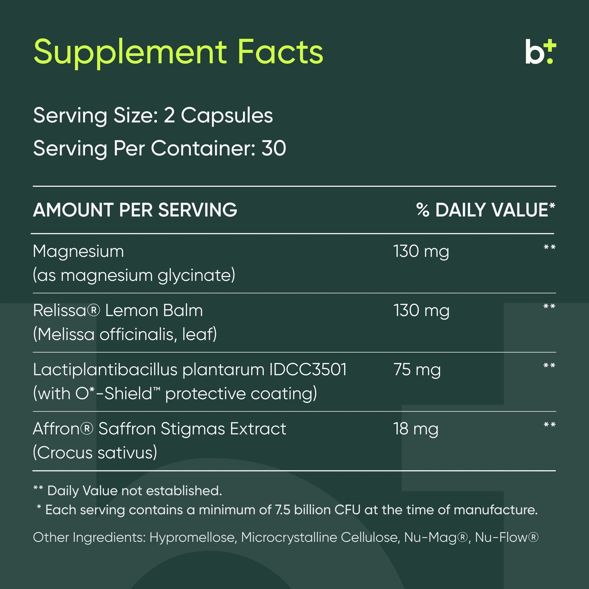 Magnesium Glycinate, Relissa® Lemon Balm Extract, Lactiplantibacillus plantarum, Affron® Saffron Extract
