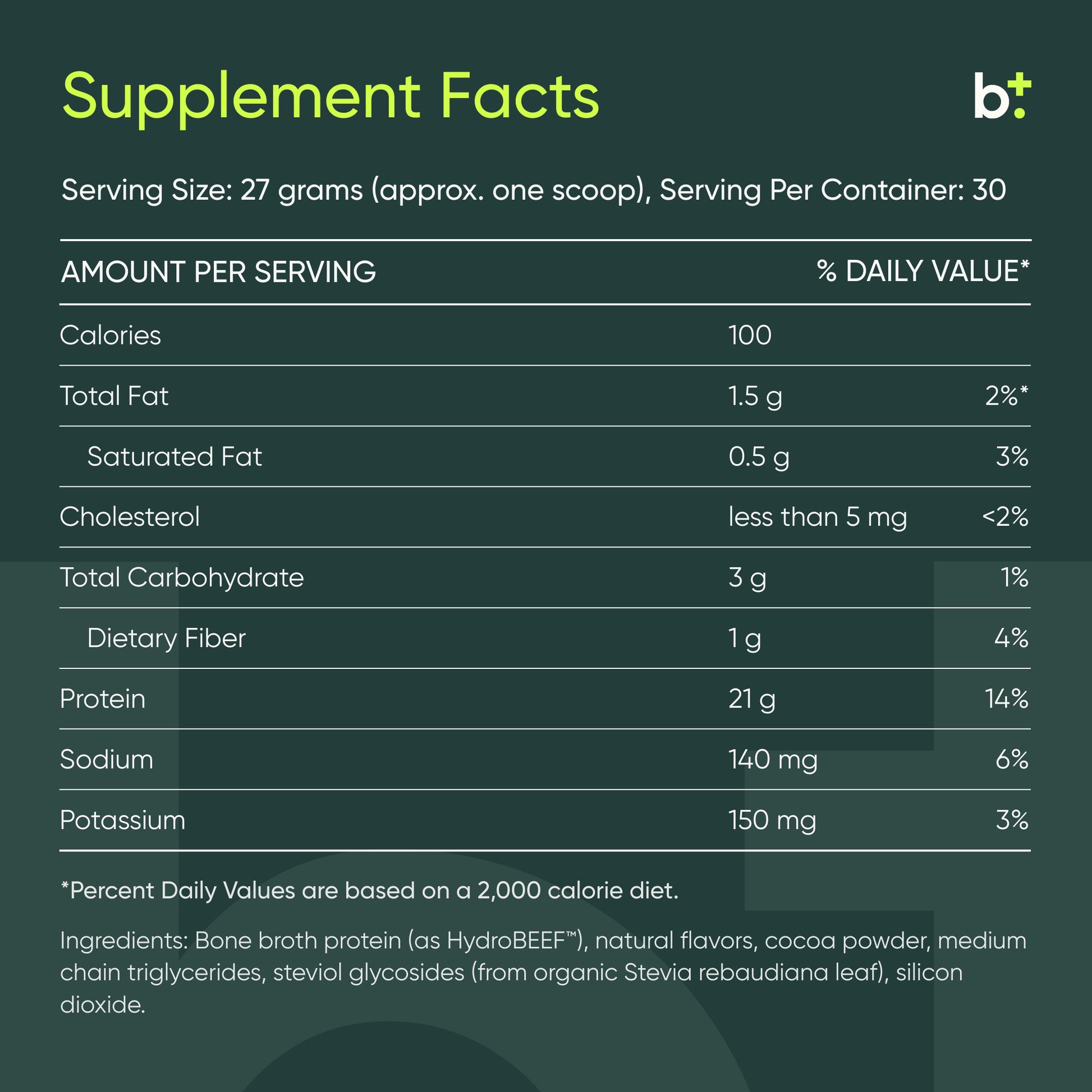 HydroBEEF (Hydrolyzed Beef Protein Isolate from Grass-Fed Cattle), Natural Flavors, Cocoa Powder (in chocolate flavor), Medium Chain Triglycerides, Stevia Leaf Extract, Silicon Dioxide