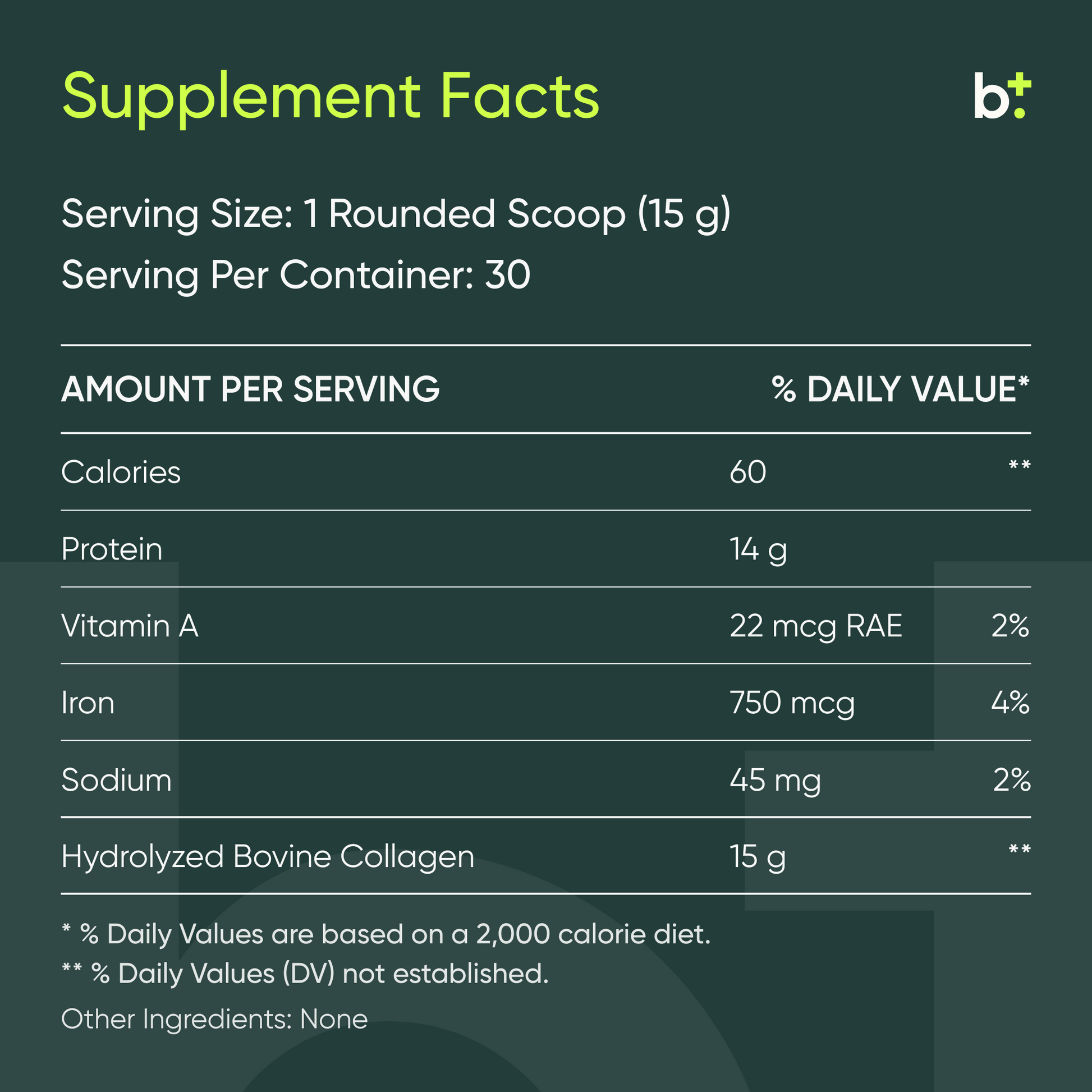 Pure grass-fed bovine collagen peptides supporting skin, joints, and connective tissue. 15g per scoop with no fillers or artificial ingredients.