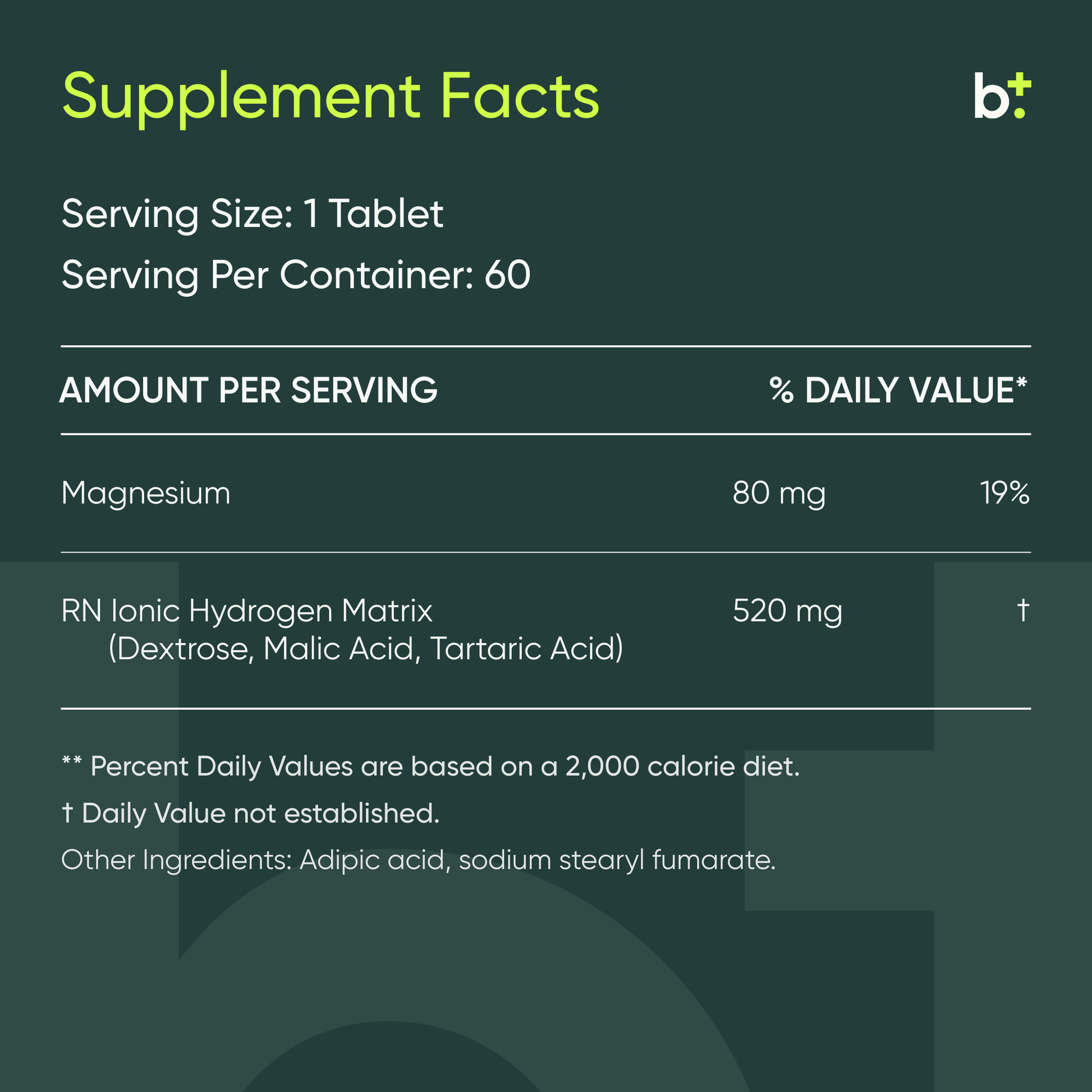 Magnesium (80mg), RN Ionic Hydrogen Matrix (520mg) containing Dextrose, Malic acid, Tartaric acid. Other Ingredients: Adipic acid, Sodium stearyl fumarate.