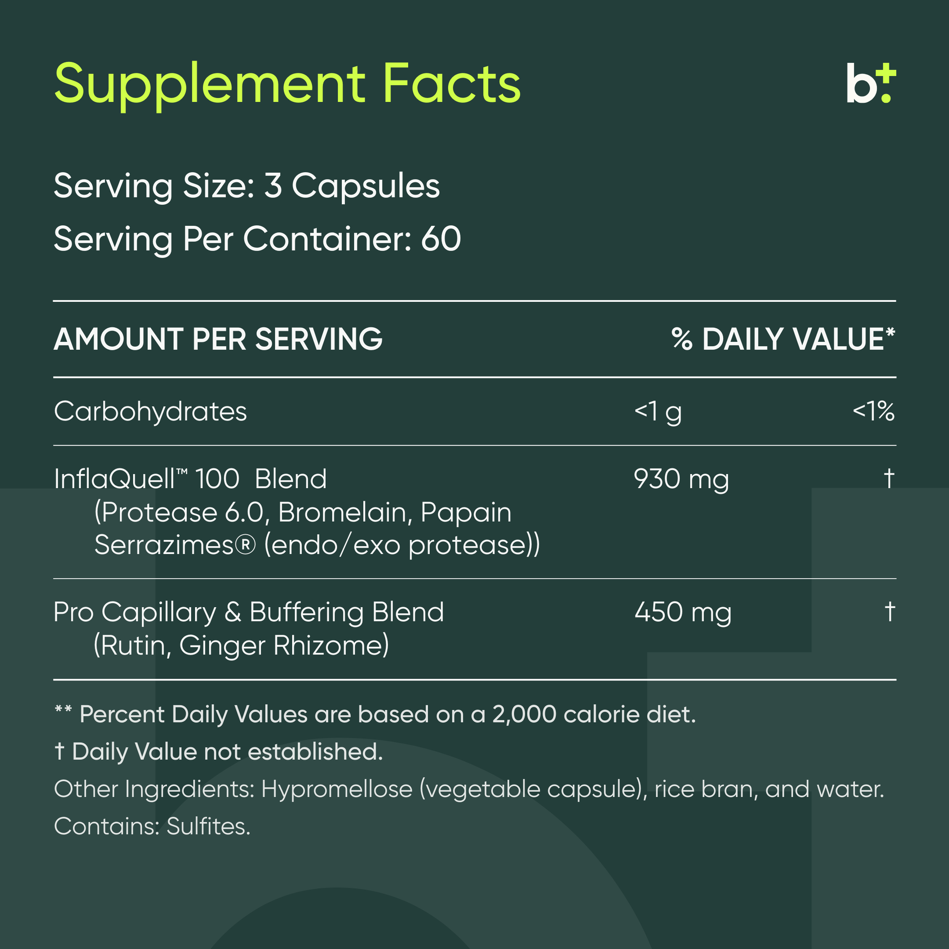 For systemic benefits, InflaQuell™ should be taken away from meals (at least 2 hours after or 1 hour before eating). This allows the enzymes to be absorbed into the bloodstream rather than being used for food digestion. The ginger rhizome in the formula provides gentle buffering to support stomach comfort even when taken without food.