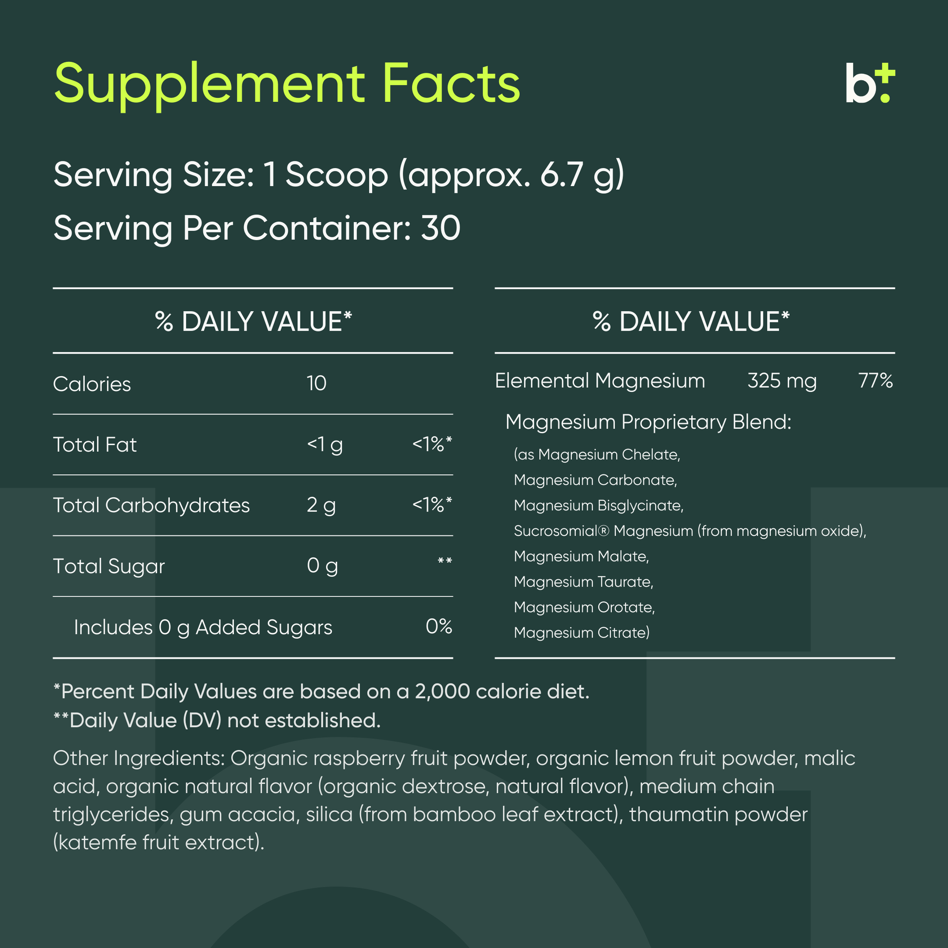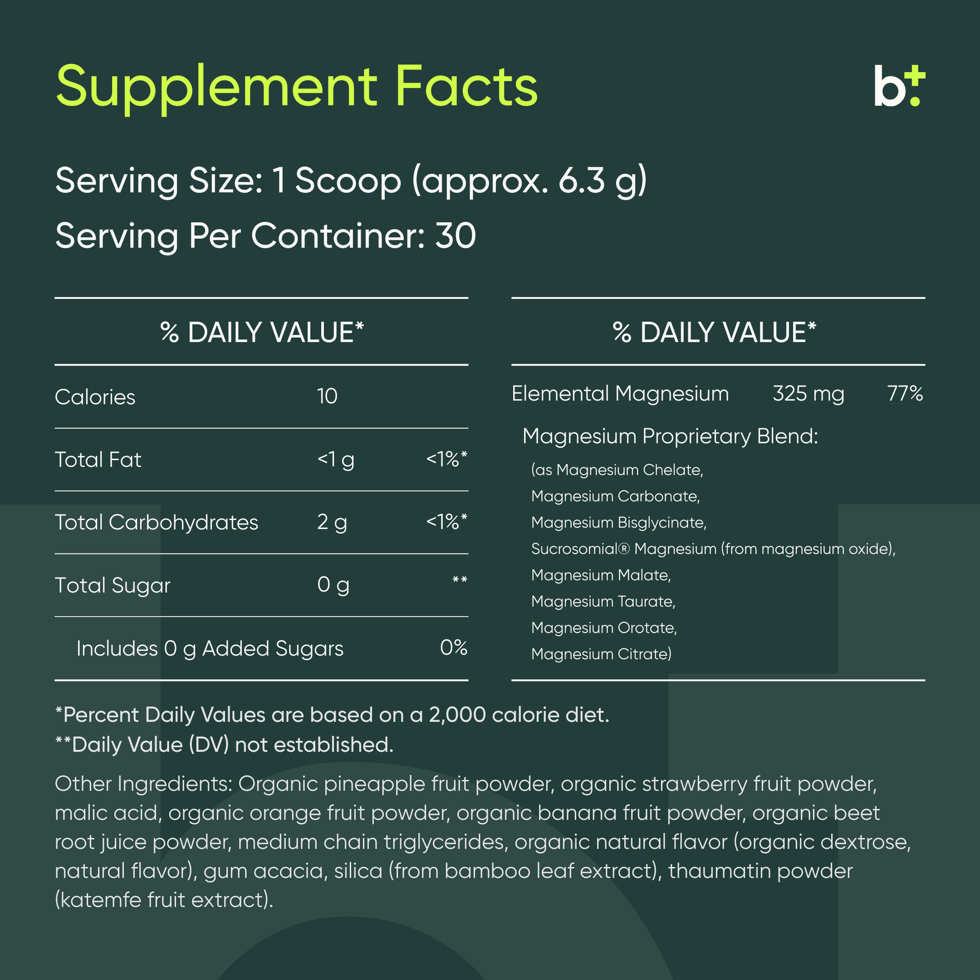 Magnesium Chelate, Magnesium Carbonate, Magnesium Bisglycinate, Sucrosomial Magnesium, Magnesium Malate, Magnesium Taurate, Magnesium Orotate, Magnesium Citrate, Vitamin B6, Medium Chain Triglycerides Powder, Bamboo Silica, Organic Fruit Powders (flavor dependent), Katemfe Fruit Extract