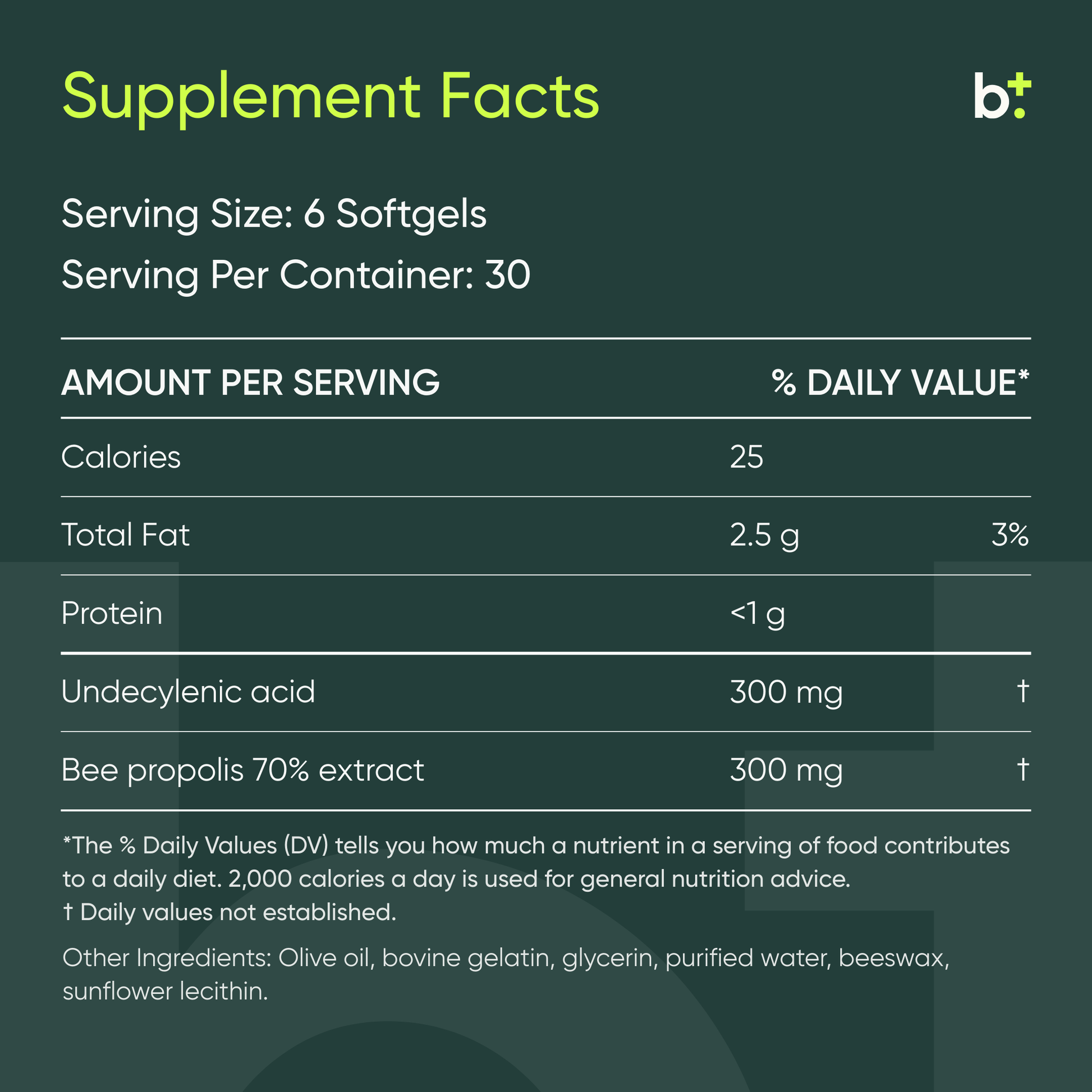 Undecylenic Acid, Bee Propolis Extract, Olive Oil, Vegetarian Capsule (modified tapioca starch, glycerin, water), Beeswax, Sunflower Lecithin