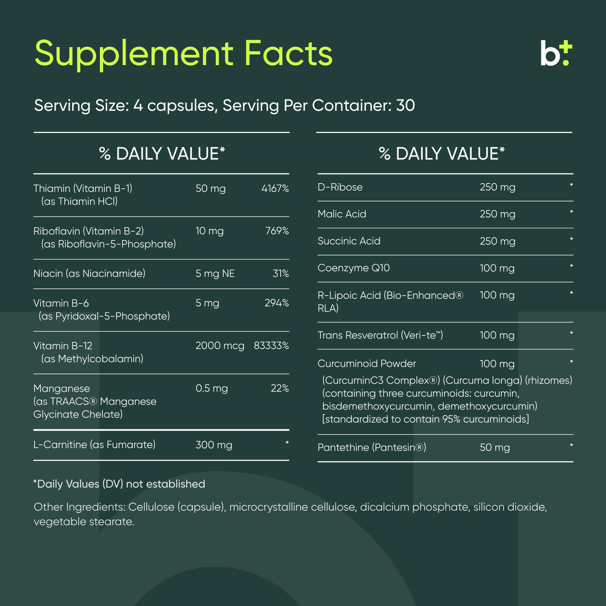 Thiamin (B1), Riboflavin-5-Phosphate (B2), Niacinamide (B3), Pyridoxal-5-Phosphate (B6), Methylcobalamin (B12), Manganese Glycinate Chelate, Creatine MagnaPower (Magnesium Creatine Chelate), L-Carnitine Fumarate, D-Ribose, Malic Acid, Succinic Acid, Coenzyme Q10, R-Lipoic Acid, Trans-Resveratrol, Curcumin C3 Complex, Pantethine