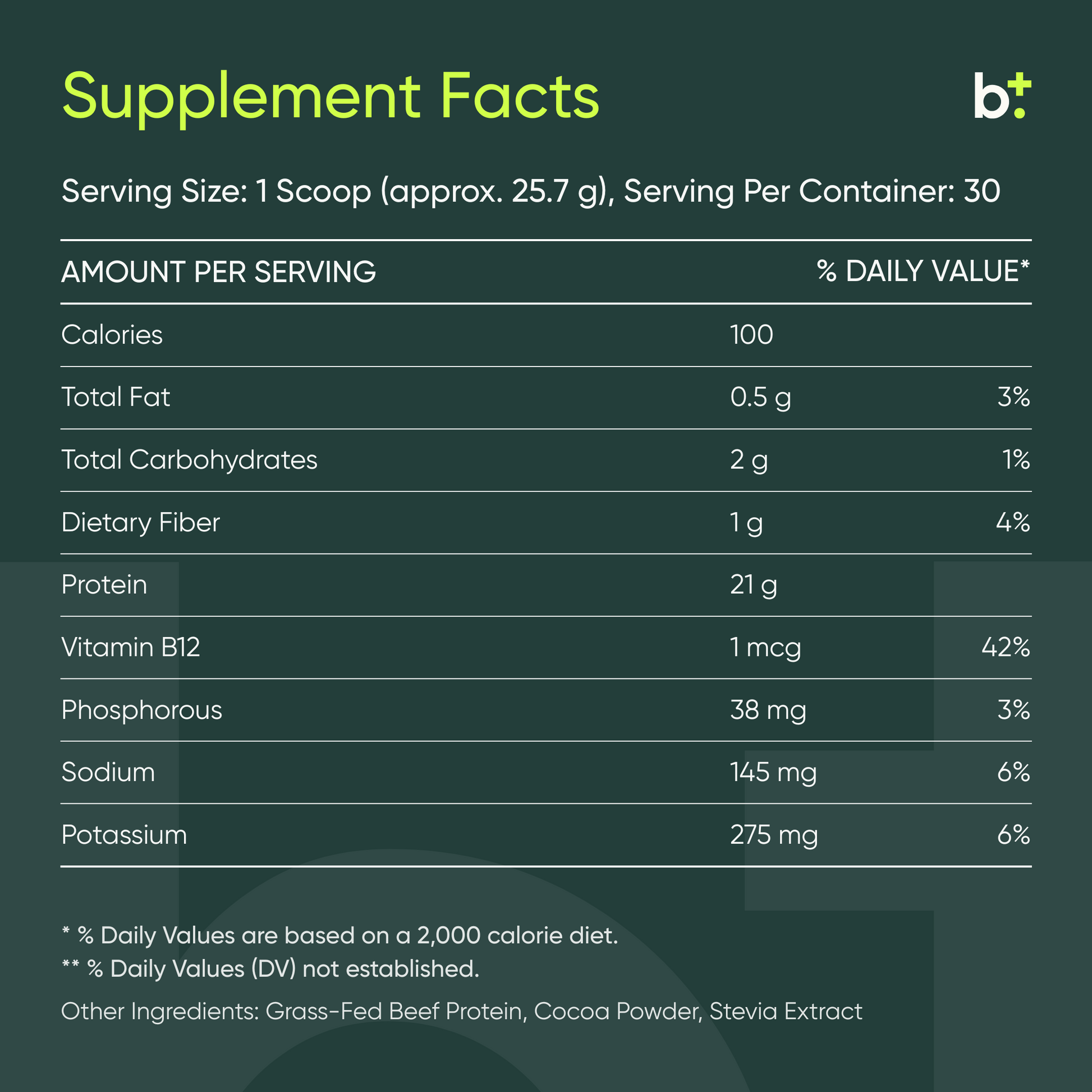 Grass-Fed Beef Protein Isolate, Natural Cocoa Powder (flavoured varieties), Stevia Extract (flavored varieties).