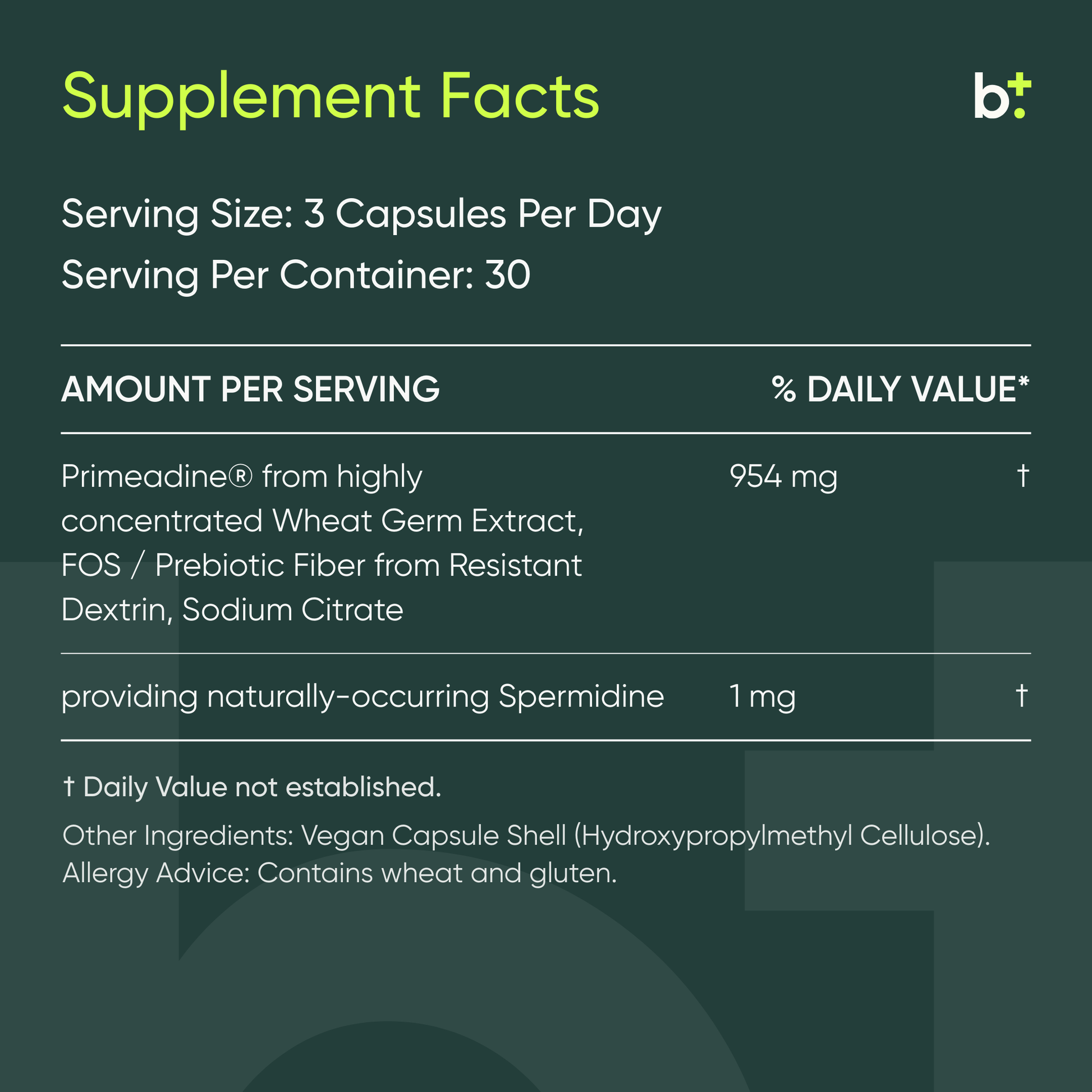 Each capsule provides 1mg of spermidine from high-quality Japanese wheat germ, plus prebiotic fiber to support your gut health.