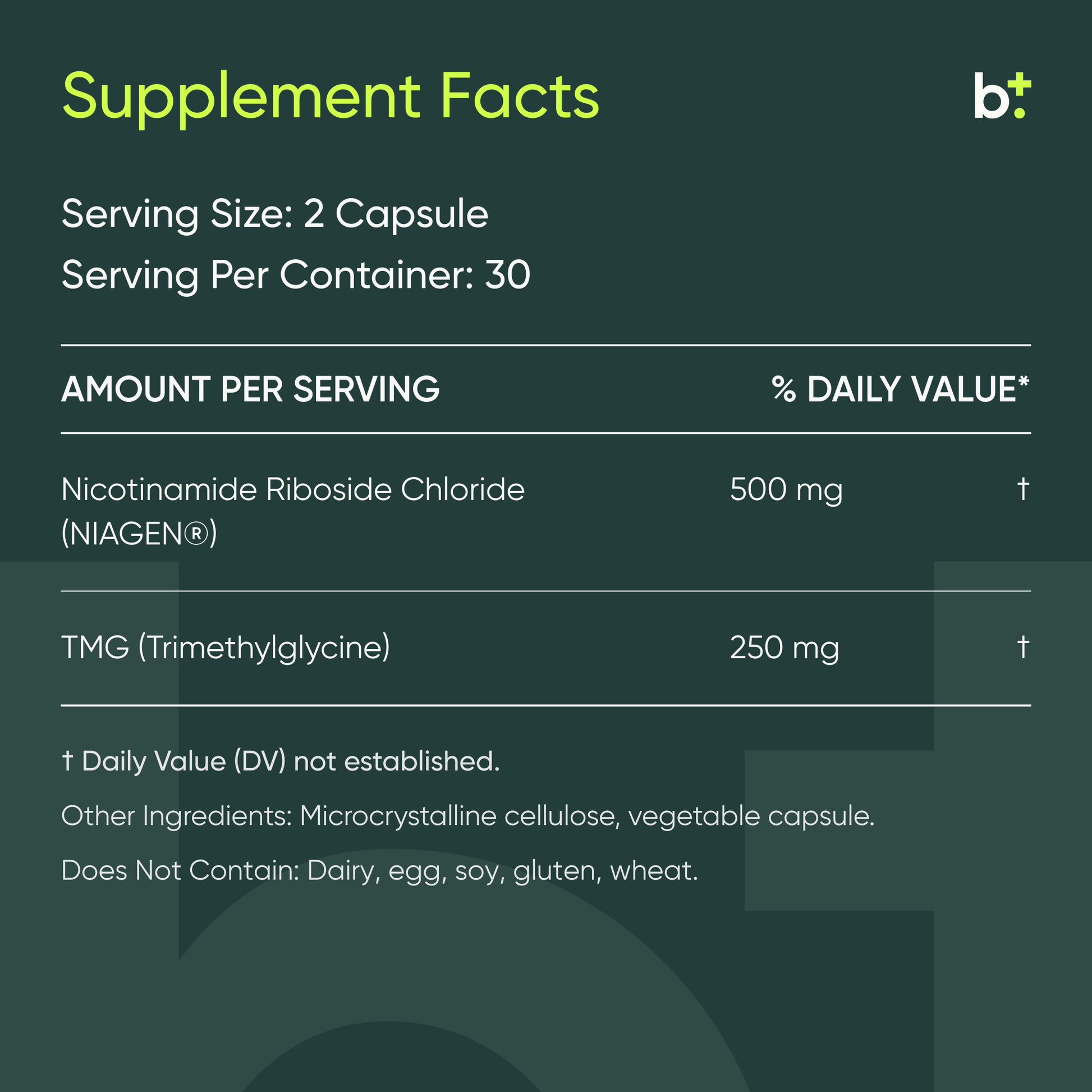 Nicotinamide Riboside (as NR Hydrogen Malate) 500mg, Trimethylglycine (TMG) 250mg, Vegetable Cellulose (capsule), Microcrystalline Cellulose