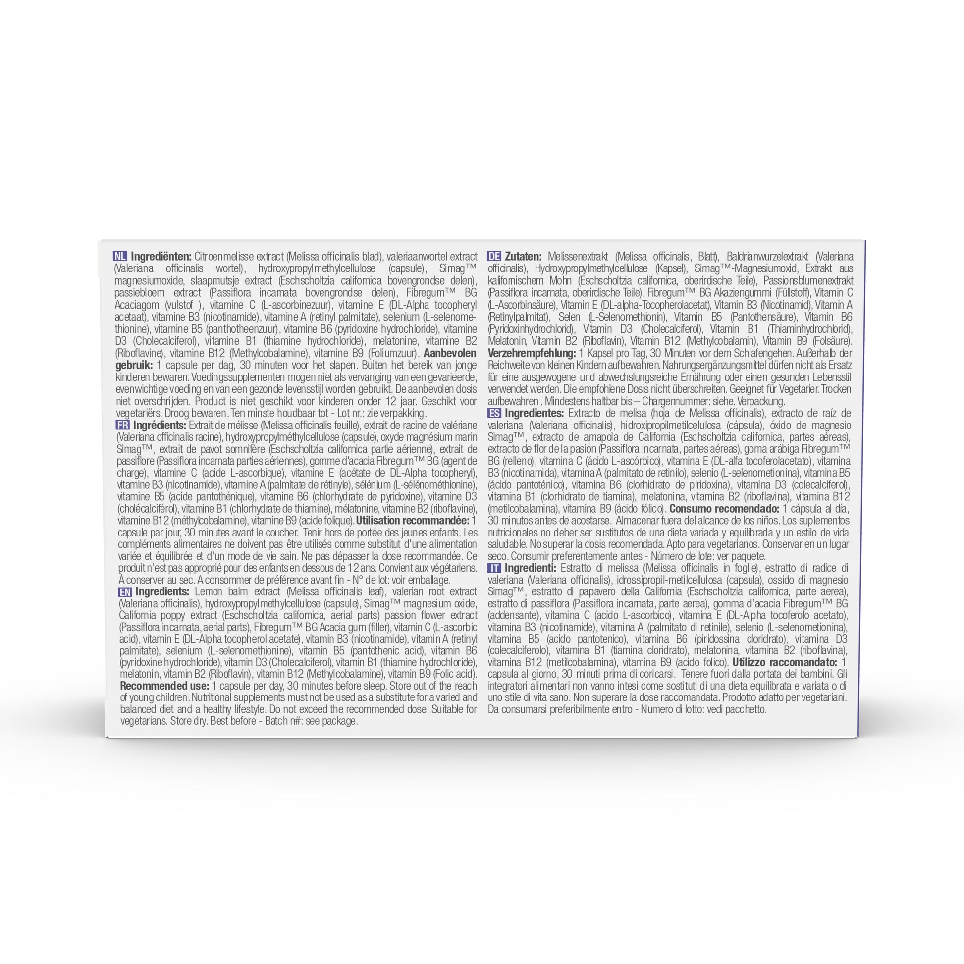 Lemon Balm 150mg, Valerian Extract 120mg, California Poppy Extract (Eschscholtzia) 84mg, Magnesium 56.25mg, Passionflower Extract 50mg, Melatonin 0.29mg, Vitamin C 20mg, Vitamin B3 3mg, Vitamin B6 1.4mg, Vitamin B9 (Folate) 100µg, Vitamin B12 2µg, Vitamin B5 1.5mg, Vitamin B1 0.35mg, Vitamin B2 0.26mg, Vitamin A 320µg, Vitamin D3 2.5µg, Vitamin E 2.5mg, Selenium 9µg, Fibregum™ BG Acacia Gum, Hydroxypropylmethylcellulose (capsule)