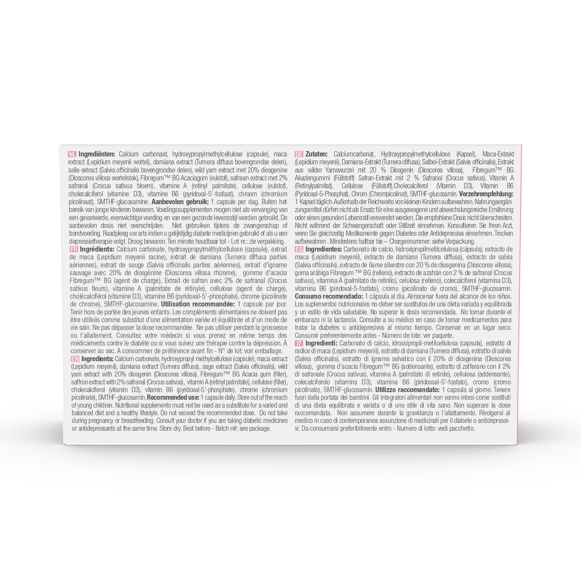 Calcium Carbonate, Maca Extract (Lepidium meyenii), Damiana Extract (Turnera diffusa), Sage Extract (Salvia officinalis), Wild Yam Extract with 20% Diosgenin (Dioscorea villosa), Fibregum™ BG Acacia Gum, Saffron Extract with 2% Safranal (Crocus sativus), Vitamin A (Retinyl Palmitate), Vitamin D3 (Cholecalciferol), Vitamin B6 (Pyridoxal-5'-Phosphate), Chromium (Chromium Picolinate), 5MTHF-Glucosamine, Hydroxypropyl Methyl Cellulose (Capsule)