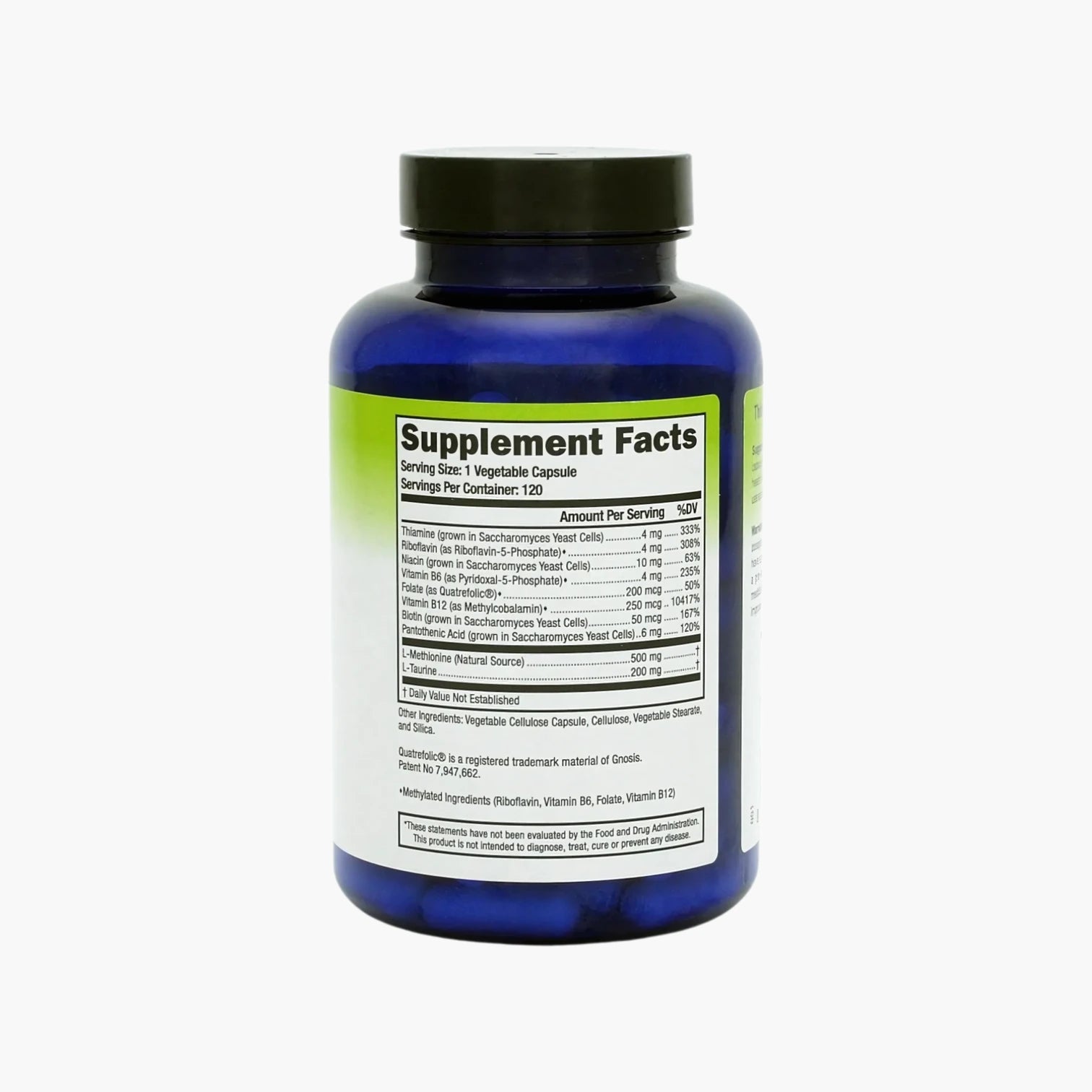 Vitamin B1 (thiamine from Saccharomyces Boulardii), Vitamin B2 (Riboflavin 5-phosphate), Vitamin B3 (Niacin from Saccharomyces), Vitamin B5 (Pantothenic Acid), Vitamin B6 (Pyridoxal 5-phosphate), Vitamin B7 (Biotin), Vitamin B9 (Quatrefolic methylfolate), Vitamin B12 (Methylcobalamin), L-Methionine, L-Taurine, Vegetable cellulose capsule
