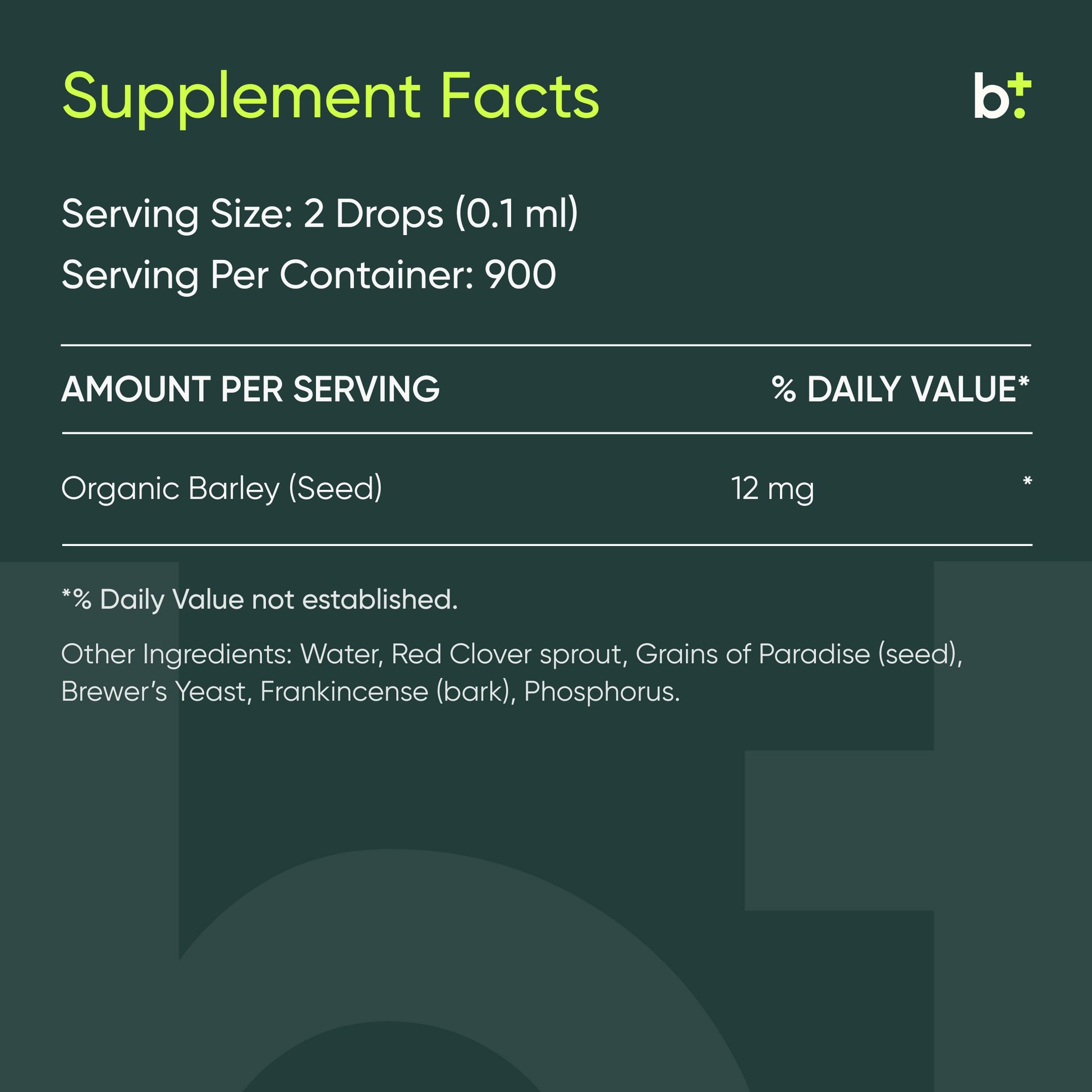 Fermented barley extract, water, red clover flower, grains of paradise root, brewer's yeast, frankincense bark, phosphorus.