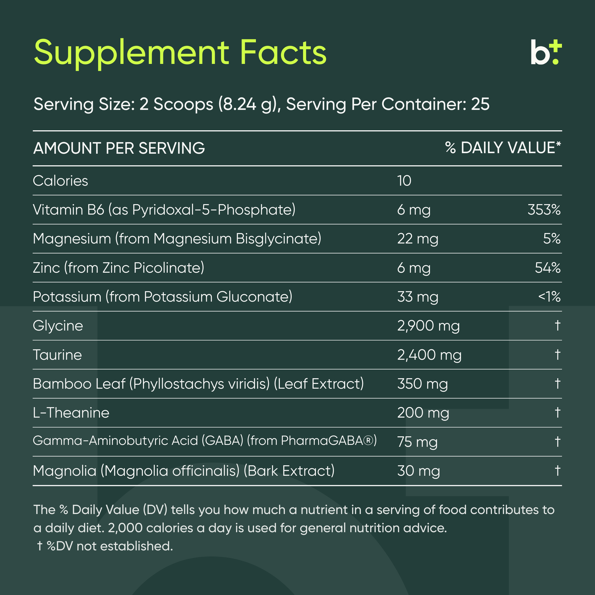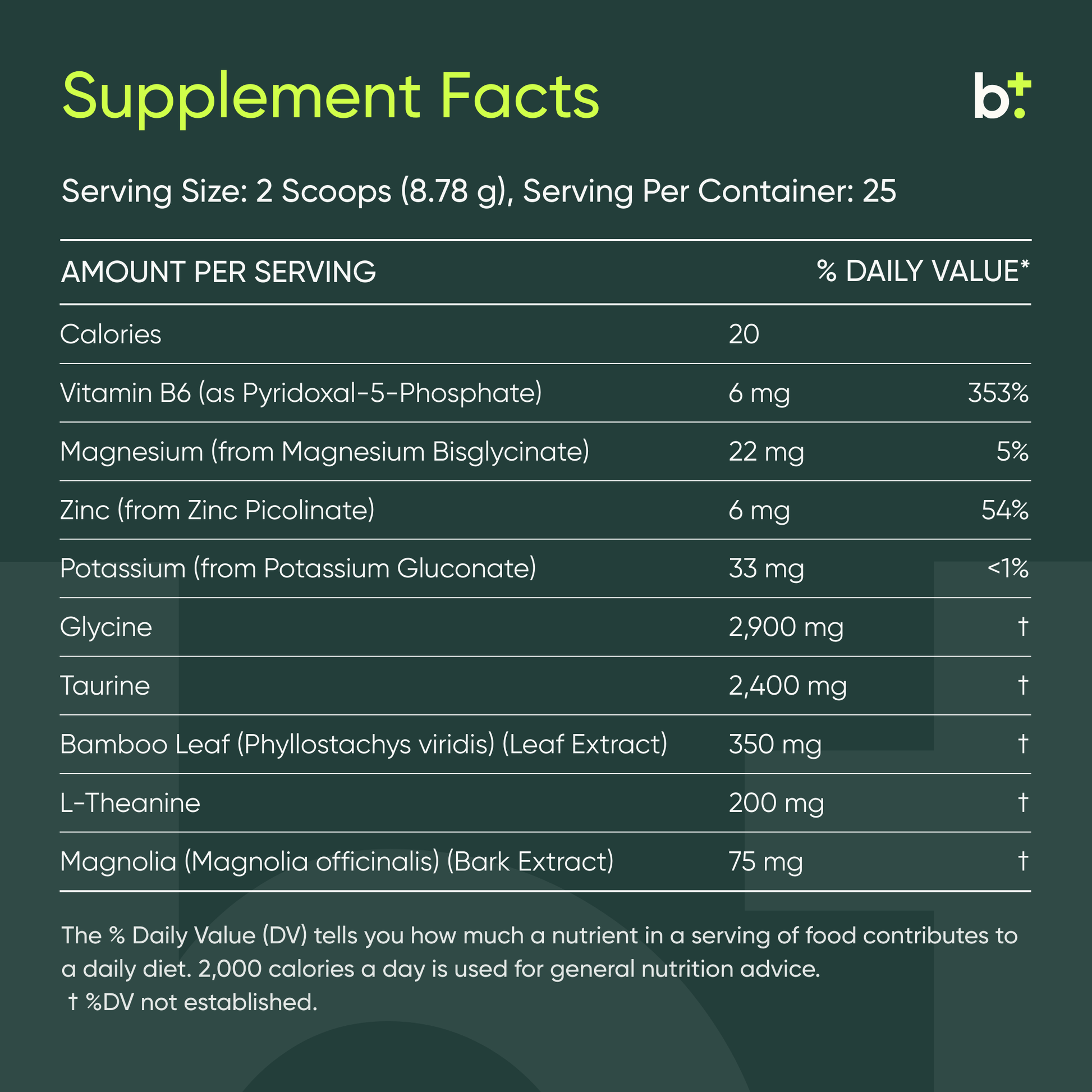 Blue Berry Dreams: Vitamin B6 (as Pyridoxal-5-Phosphate), Magnesium (from Magnesium Bisglycinate), Zinc (from Zinc Picolinate), Potassium, L-Glycine, L-Taurine, L-Theanine, Gamma-Aminobutyric Acid (GABA), Magnolia Bark Extract (Honokiol & Magnolol), Bamboo Leaf Extract, Organic Grape Juice Powder, Blue Spirulina, Calcium Citrate, Organic Mixed Berry Powder, Organic Monk Fruit Extract, Malic Acid, Thaumatin Powder, Organic Beetroot Juice Powder