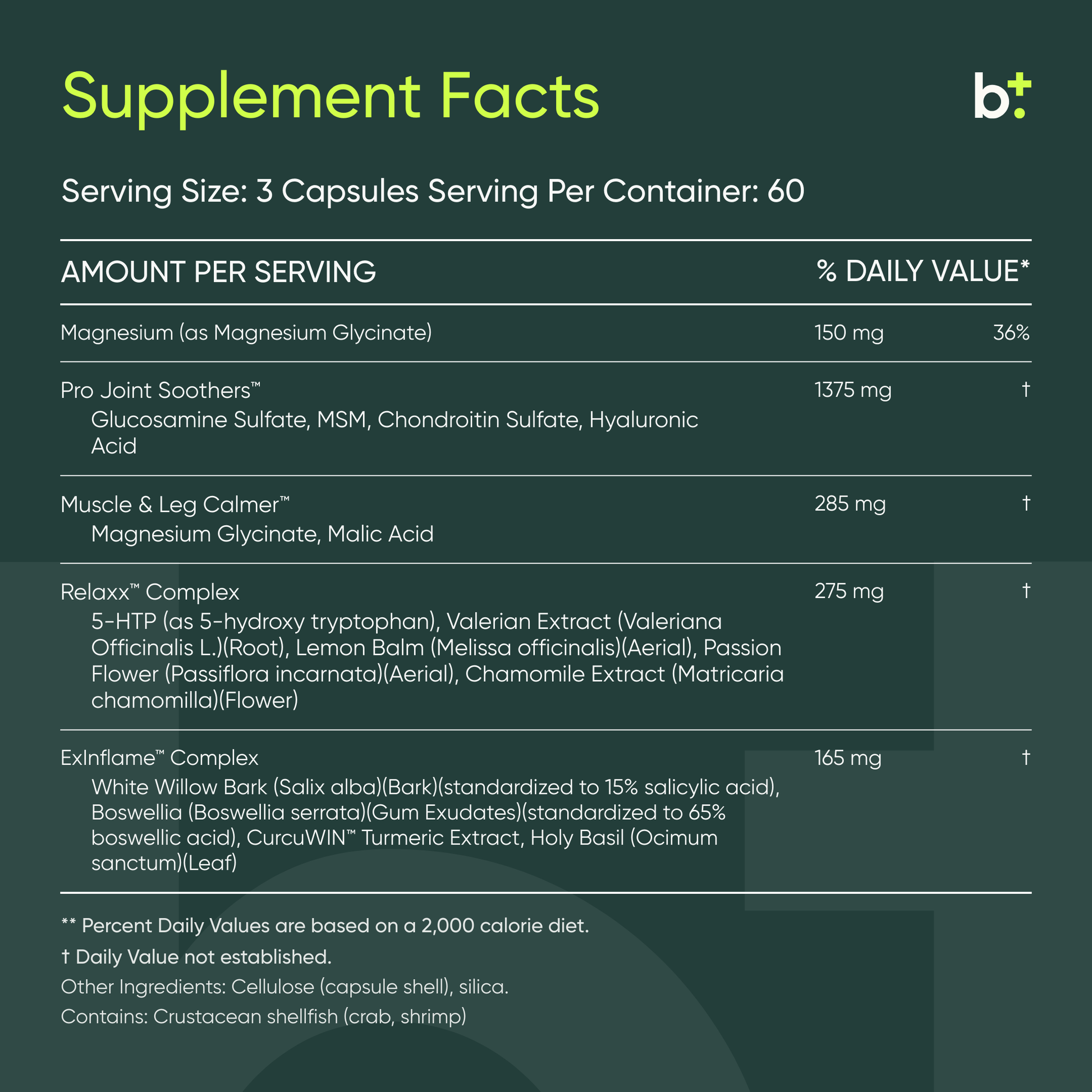 Magnesium Glycinate, Glucosamine Sulfate, MSM (Methylsulfonylmethane), Chondroitin Sulfate, Hyaluronic Acid, Malic Acid, 5-HTP (5-Hydroxytryptophan), Valerian Root Extract, Lemon Balm, Passion Flower, Chamomile Extract, White Willow Bark, Boswellia Serrata Extract (standardized to 65% boswellic acid), CurcuWIN™ Turmeric Extract, Holy Basil