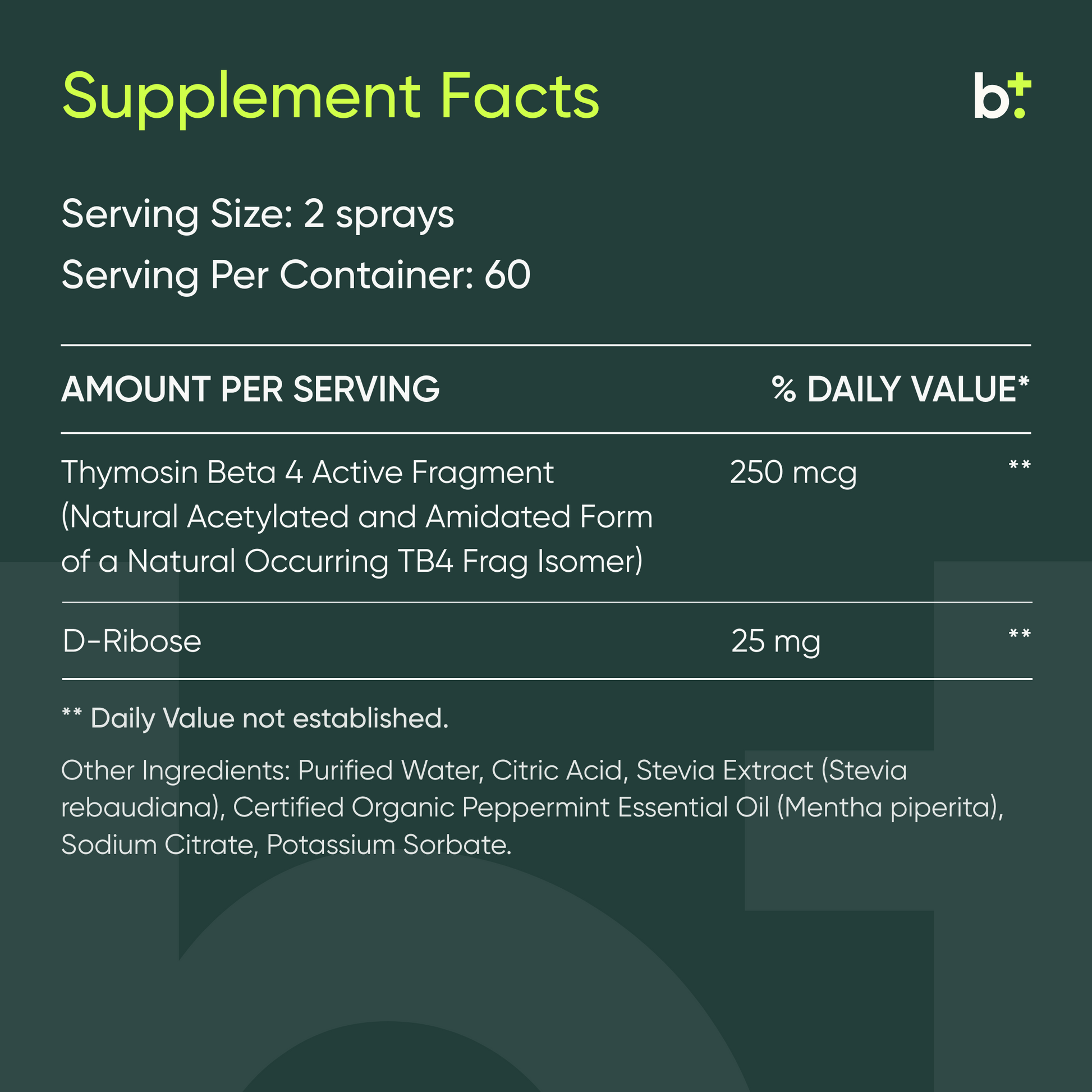 Peppermint-flavored oral spray with 250mcg Thymosin Beta 4 fragment and 25mg D-Ribose to support tissue repair, recovery, and cellular energy production.