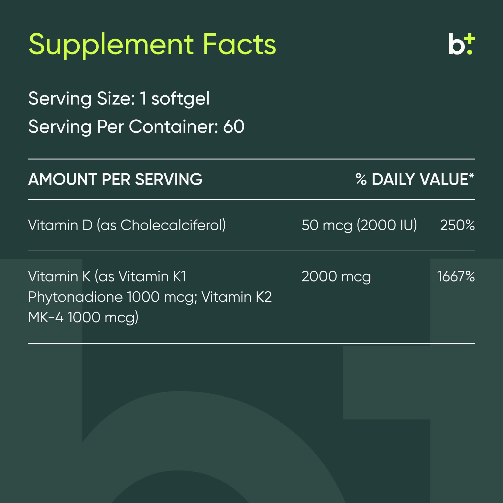 Synergistic formula combining 2,000 IU vitamin D3 with vitamin K1 to support bone density, cardiovascular health, and immune system balance.
