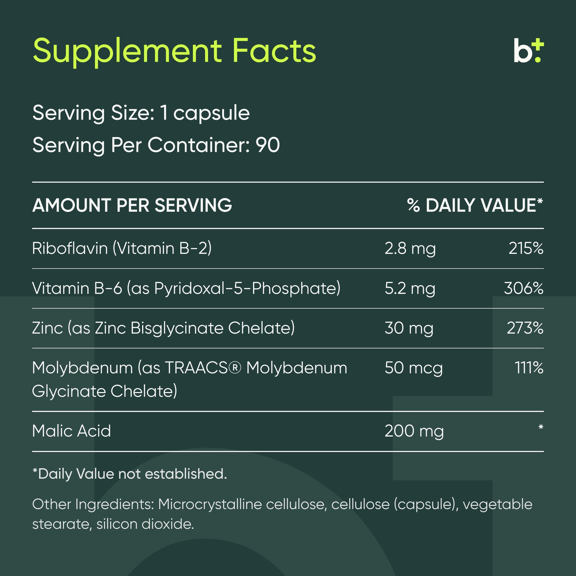 Zinc (as Zinc Bisglycinate Chelate - Albion TRAACS), Riboflavin (Vitamin B2), Pyridoxal-5-Phosphate (Vitamin B6), Molybdenum (as Molybdenum Glycinate Chelate - Albion TRAACS), Taurine, Malic Acid, Microcrystalline Cellulose, Cellulose (Capsule), Vegetable Stearate, Silicon Dioxide.
